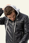 Crafted from soft sheepskin leather with a fine grain and slightly textured matte finish. It features a lined round collar and a contrasting fabric hood, blending classic styling with sporty flair. The central zip closure is highlighted by tone-on-tone stitching. Two zipped side pockets and one inside pocket offer practicality. The textile lining provides comfort in all seasons, and the regular fit suits all body types.