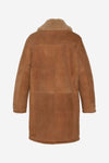 Lavet af ruskindsfårskind, denne jakke har et lige snit, der tilpasser sig alle kropsformer. Den har en knaplukning, to store påsyede lommer med klap og en naturlig fåreuldskrave, der giver optimal isolering. Længden på midten af låret og de lange ærmer med synlige sømme fremhæver dets sofistikerede look. Den indvendige foring af fåreskind giver ekstra varme, hvilket gør denne jakke til et ideelt valg til efterår og vinter.