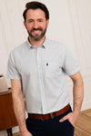 Denne skjorte har korte ærmer, der er foldet over og holdes på plads af en amerikansk fodstilskant. Skjortekraven føder; en enkelt knaplomme. Runde, hvide knapper er syet på denne knaplukning og sikrer lukning på aksen. En lomme er placeret på siden af tasken. venstre bryst og er dekoreret med det broderede mærkelogo. i en marineblå farve.