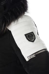 Sort farve med quiltet hvidt lammeskindsindlæg. ved skuldrene, på toppen af ærmerne og nederst på ryggen.