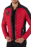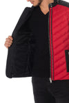 JIM M100 RED er en nylon dunjakke dekoreret med kunstlæderindsatser på kraven og på lommerne.