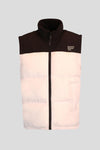 Med en høj krave, der kan lukkes langs aksen med en lang metallynlås, er denne jakke sort i sin overdel og hvid forneden. To lommer er placeret på hver side og mærkets signatur er skrevet med hvidt på siden. venstre bryst. Ærmerne er aftagelige og har elastik i enden.