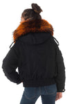 Denne korte jakke har en fast hætte prydet med en fantastisk brændende orange vaskebjørnpels, der kan tages af med trykknapper.