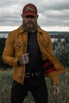 Liggør den amerikanske guldalder med GOLDRUSH-jakken fra Master, et stykke, der genopliver ånden i det fri med sit patinerede cognacbøffellæder og vintage-trucker-æstetik.