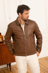 Brown leather shirt collar jacket - Image n°1