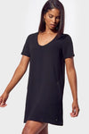 Denne korte kjole er sort med lav halsudskæring. dybt design, korte ærmer og raglanlommer med imiteret læderindlæg. Dens knappede slids bagpå giver den en bevist charme og fremhæver den smarte placering, der består af varen. af perforeret sejl og en imiteret læderindsats pyntet med en metalnitter.