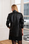 Denne sorte jakke er lavet af kvalitetsfårskindslæder. og har en fantastisk 3/4, som vil være et hit hos fashionitas. Jakken har en stand-up krave, der er typisk for bikerånden. Det vil give dig et look med stærk karakter. Den centrale lukning er trykknapper med sølv metalliske knapper, som er en del af charmen ved denne tidløse jakke. De nederste skrå lommer har lynlås. Overfladen har smukke syninger og topstikninger.