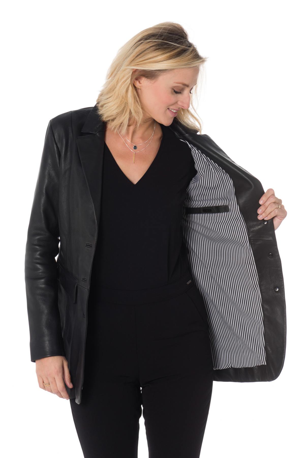 Women's long blazer in black sheepskin leather - Image n°3