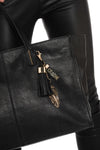 Denne taske har en udsmykket karabinhage. af kvaster (et smukt gyldent blad, en læderpompon og mærkelogoet), som du kan hente. meget nemt og kan bruges som nøglering.
