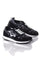 Disse sneakers i to materialer: trykt tekstil; camouflage- og ruskindslæder sort hviler på en stor hvid elastomersål.