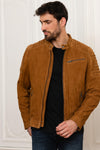 DAYTONA vender tilbage til læderjakken og giver den et strejf af modernitet. ved at tilbyde sin DOMISUEDE GOAT SUEDE COGNAC herrejakke. En jakke af typen bikerkrave lavet i gedeskind og fås i slim fit.