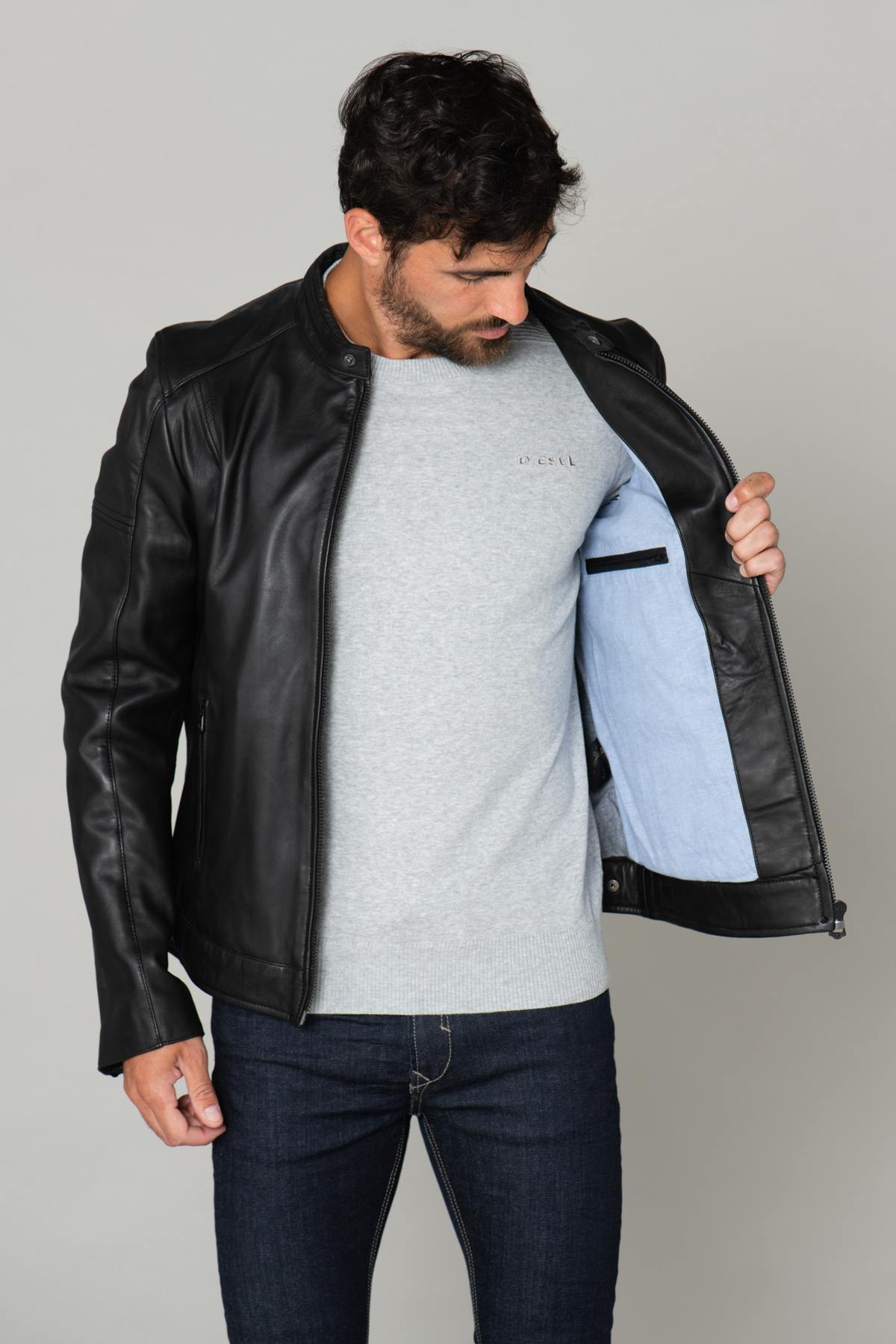 Med; Med en bikerkrave med trykknapper og en aksial metallynlås er denne jakke en perfekt illustration af bikerjakken. Den er godkendt. To lynlåslommer i siderne og to lynlåse i enden. af hvert ærme. Den raffinerede skræddersyet giver en klassisk og chik stil til dit outfit. dette tøj. Bomuldsforet er udstyret med en lynlåslomme med læderfinish.