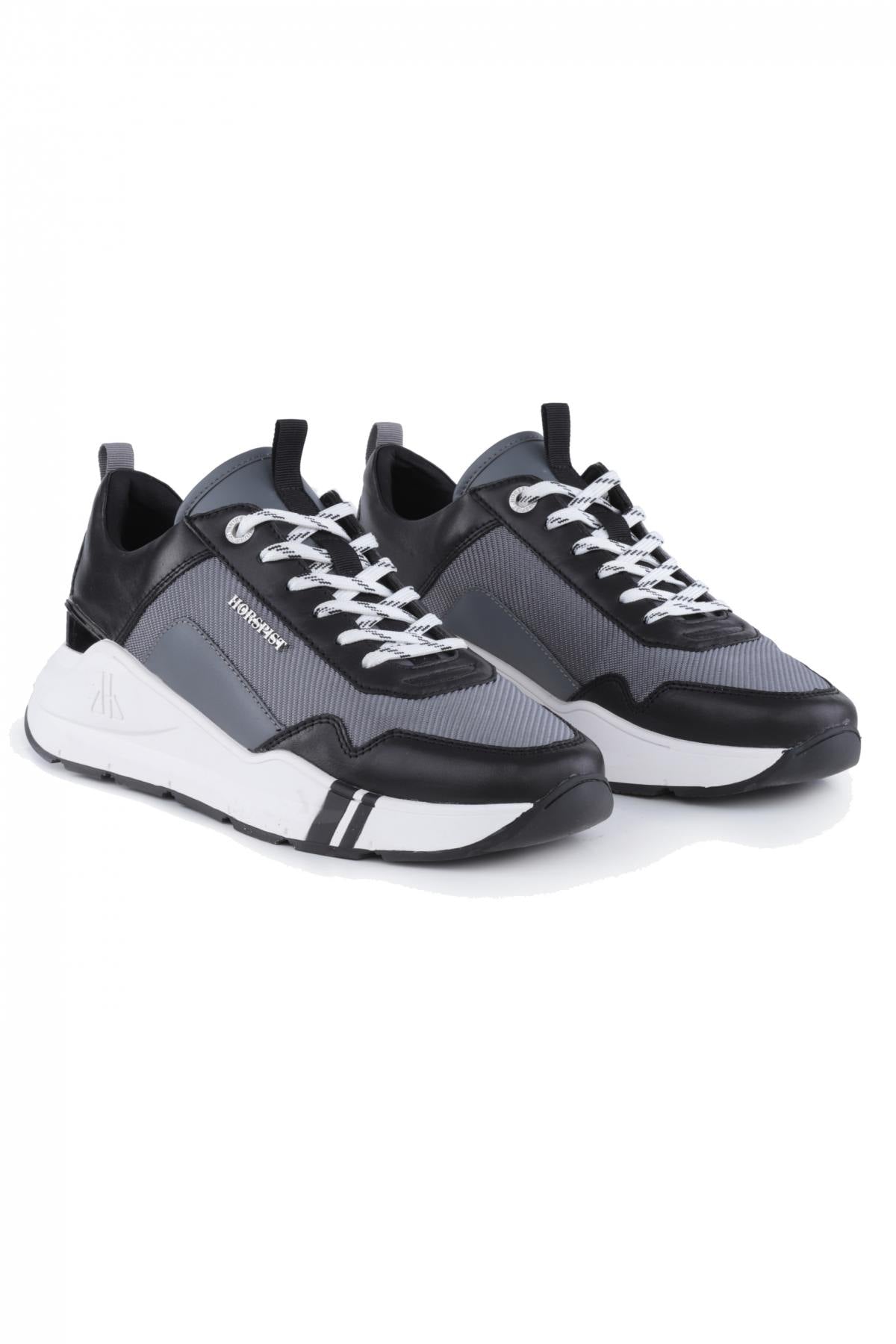 Overdelen i læder er grå med sorte striber, mens sålen også er hvid og sort. end snørebåndene. Sålen er hævet til bagsiden og dekoreret med en flocket metalmedaljon. af mærkenavnet. Interiøret er lavet af tekstilmateriale, som giver dig rigtig komfort, når du har det på. På siden På ydersiden af disse sneakers er HORSPIST repræsenteret der. på en artikuleret måde.