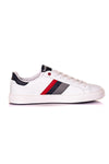 Den trendy hvide farve er forstærket med dens smarte detaljer, herunder f.eks. kontrastbånd med høj tæthed; på siden, som gør denne models charme. Snørebåndene er flade og styres af 7 par øjer, inklusive en metallisk rød til klasse. Den flade hæl gør den til en autentisk urban sneaker med forstærket forstærkning; bagenden. Logoet er syet på pløsen og trykt. på indersålen, samt på et af sidebåndene.