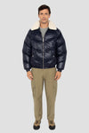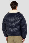 Oversized shiny textile down jacket with faux fur collar - Image n°1