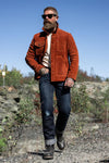 The Field Jacket Copperhide is a modern take on the classic work jacket, crafted from full-grain suede leather in a deep copper shade that develops a rich patina over time. With its tailored fit, it enhances the male silhouette while allowing full freedom of movement. It features four outer pockets, including two hand-warmer pockets, strategically placed and reinforced for daily use. The collar and cuffs are lined with full-grain buffalo leather for added structure and durability. The interior is unlined, offering greater breathability during warmer months. Custom solid zinc buttons with an antique finish complete this well-crafted, versatile jacket.