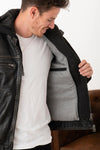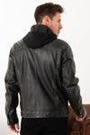 A hooded leather jacket for men, the PHILADELPHIA RUB OFF BLACK by Cityzen embodies urban spirit with a sleek and assertive style. A confident look blending comfort and modernity.