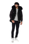 Fluffed hood decorated with magnificent black raccoon fur, removable by snap.