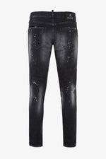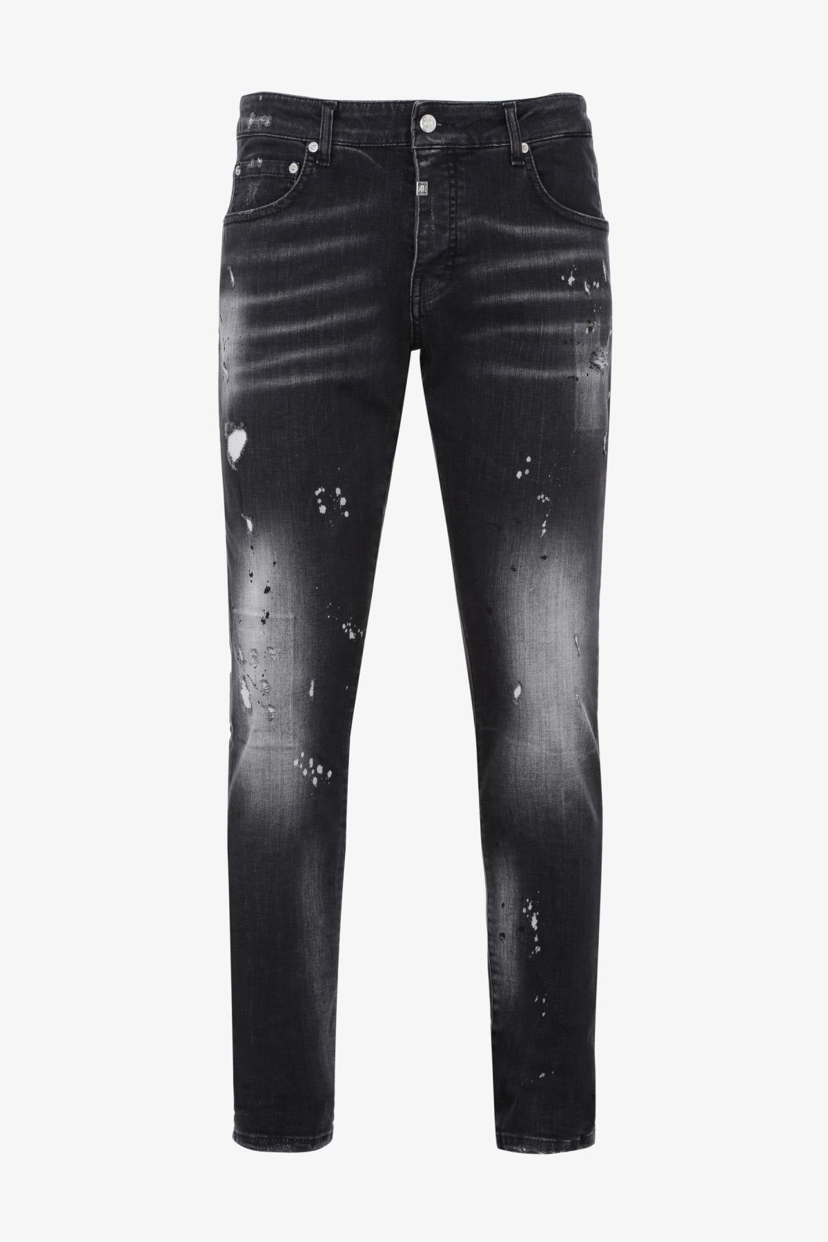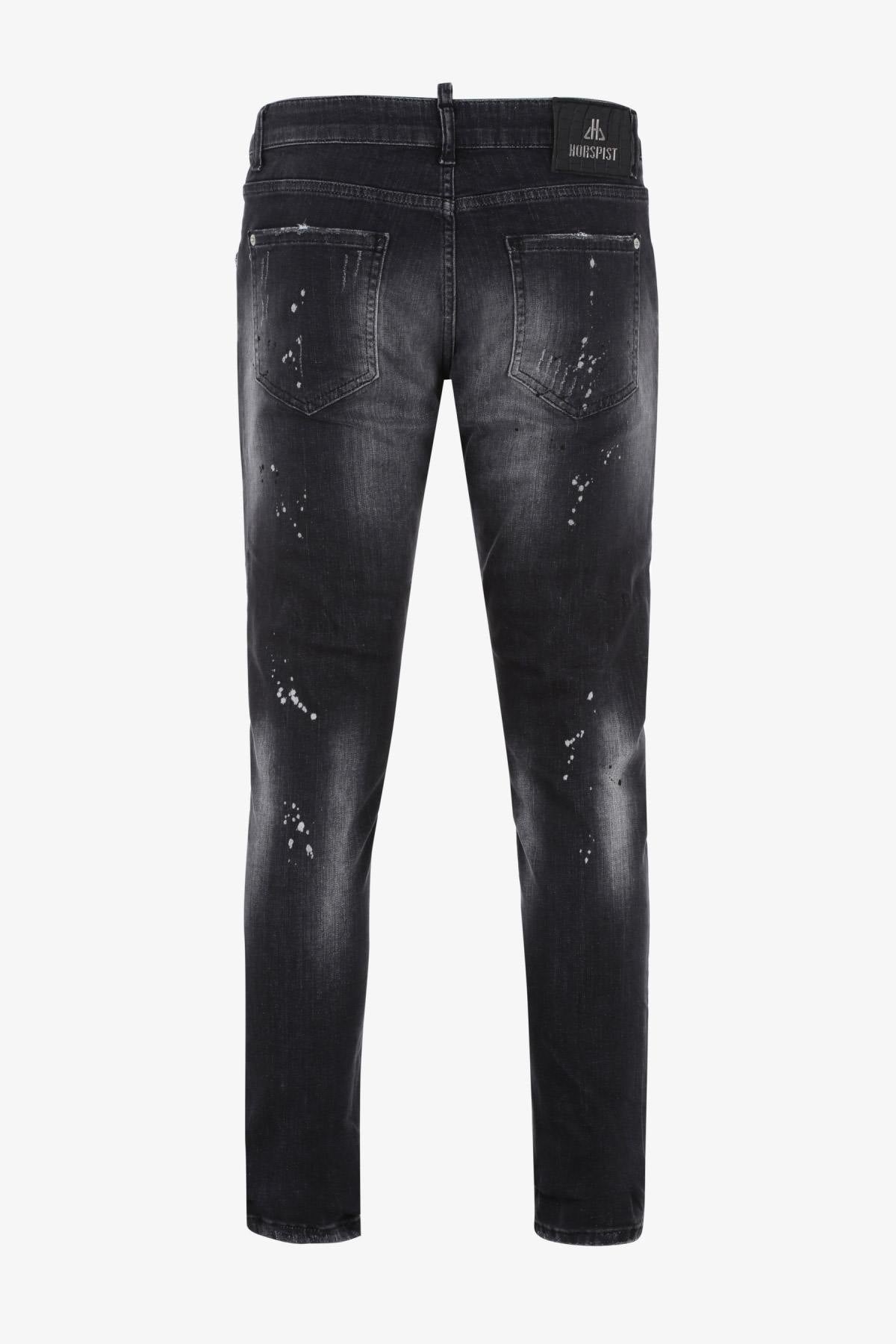 Nicely washed. and decorated with white spot patterns arranged çà and there, these black pants close at the same time. at the front with a zip and a metal button. Small metal rivets adorn the back and front pockets, as well as the waistband at the loops. A black branded label is sewn at the waist, while another smaller one is placed on the button placket. These jeans are slightly frayed. à certain places, which enhances its side. original.