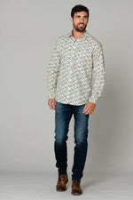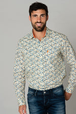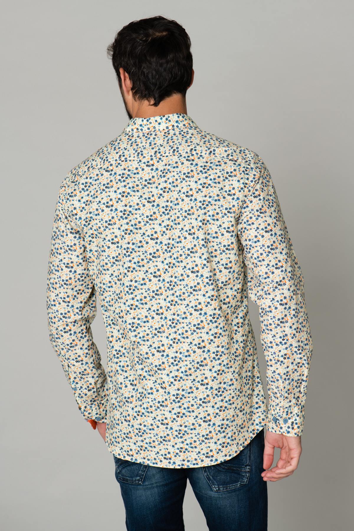 The simplicity of this The feature of this shirt is visible by its classic button placket, simple collar and long buttoned sleeves. The touch of originality is provided by printed matter. floral that goes well with wonderful with the beige color of the shirt. The brand logo is embroidered. in orange on the side left chest.
