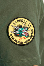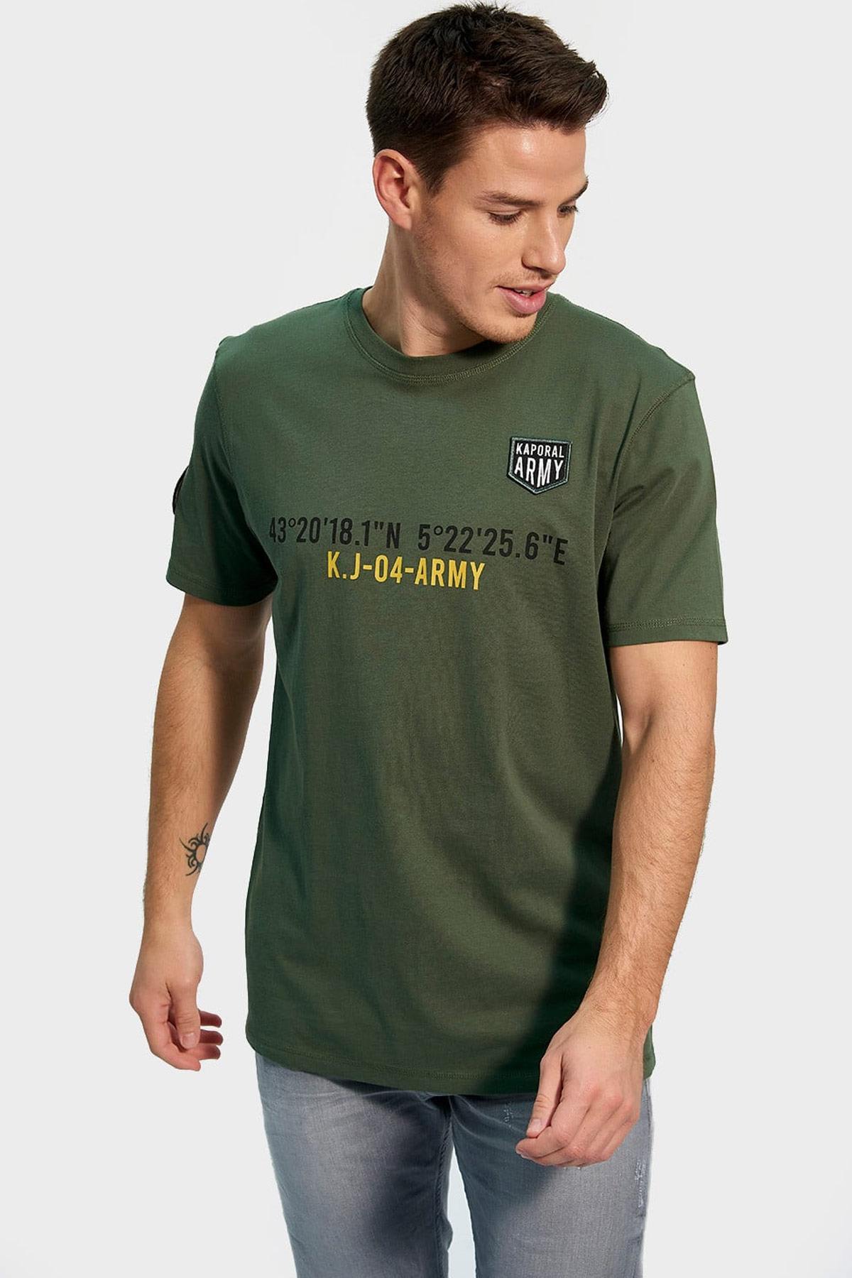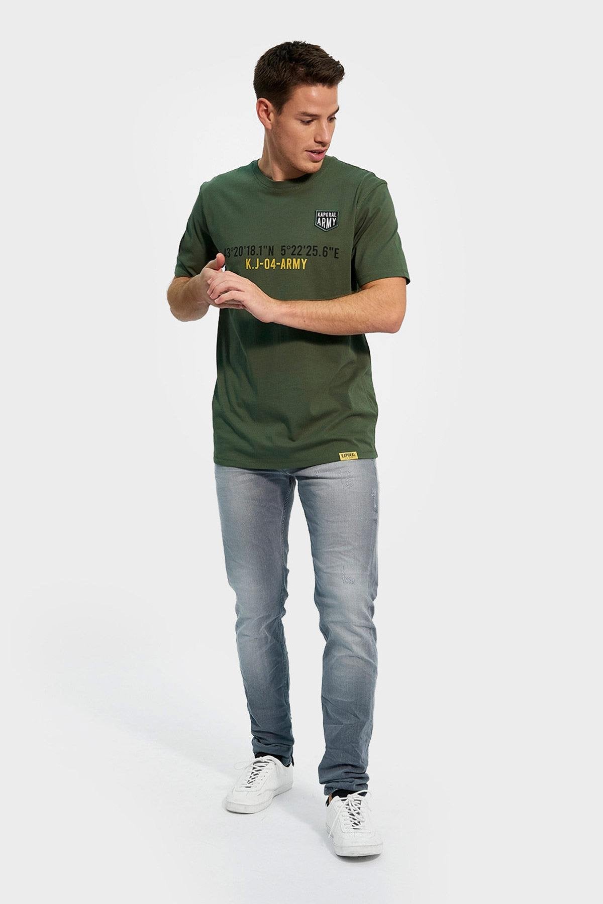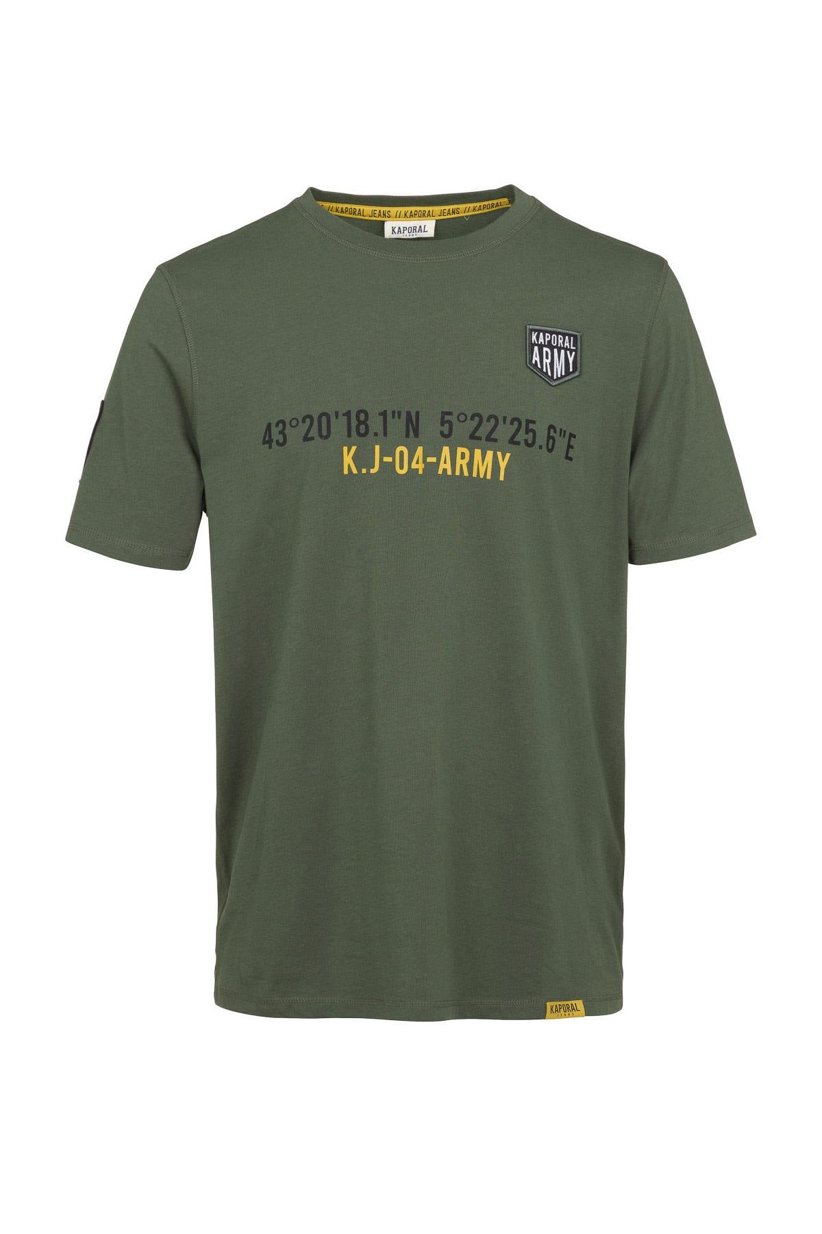 Geographic coordinates are printed in black on the chest, just above the inscription KJ-04-ARMY in yellow. A printed black patch Kaporal Army is flocked; on the side left chest and matches the left chest the one sewn at the right sleeve. On the back, the message ‘‘ Break the rules never look back’’ is also registered. The brand information is present on the edging. sewn on the back of the collar and on the bottom of the t-shirt.