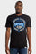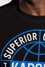 The model has a round neck and short sleeves. A blue logo formed white letters highlighted on the t-shirt capture the attention. The design is reminiscent of a basketball and all the American inspiration of this product. The image is placed over an overall opaque black which further highlights it in the foreground. A white Kaporal Jeans label provides a beautiful color contrast despite the appearance. its size.
