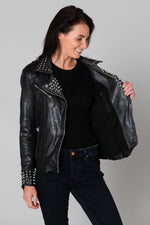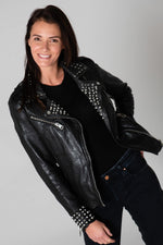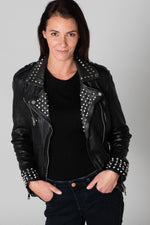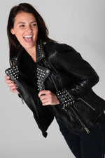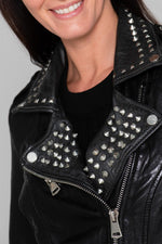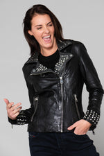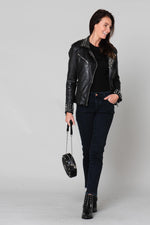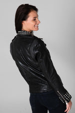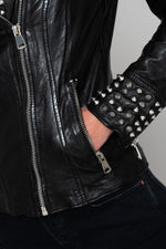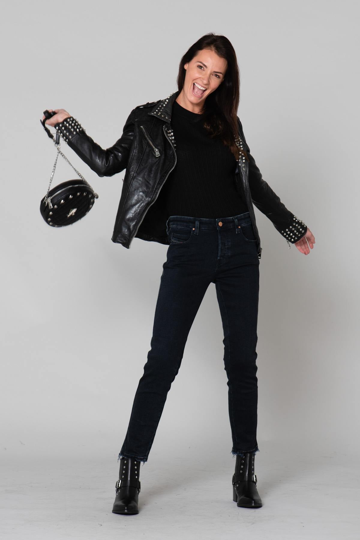 Black in color, it has a low-cut collar. in a perf style which gives birth to; an off-center zip to the right. A small side pocket is sewn on the side of the bag. right of the chest and two others are at the level of the flanks. The ends of the long sleeves are also zipped. The touch of originality This jacket features numerous metal rivets plated on the neckline and cuffs.