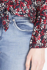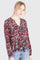 This tieable drawstring gives a flared look. à the base. The collar is V with axial buttons. The long sleeves are also buttoned. The flocked floral pattern The entire surface of this blouse combines different colors including red, blue and even off-white.