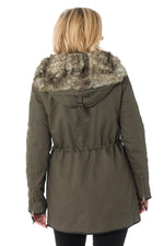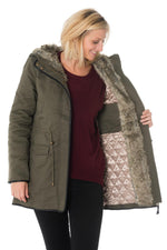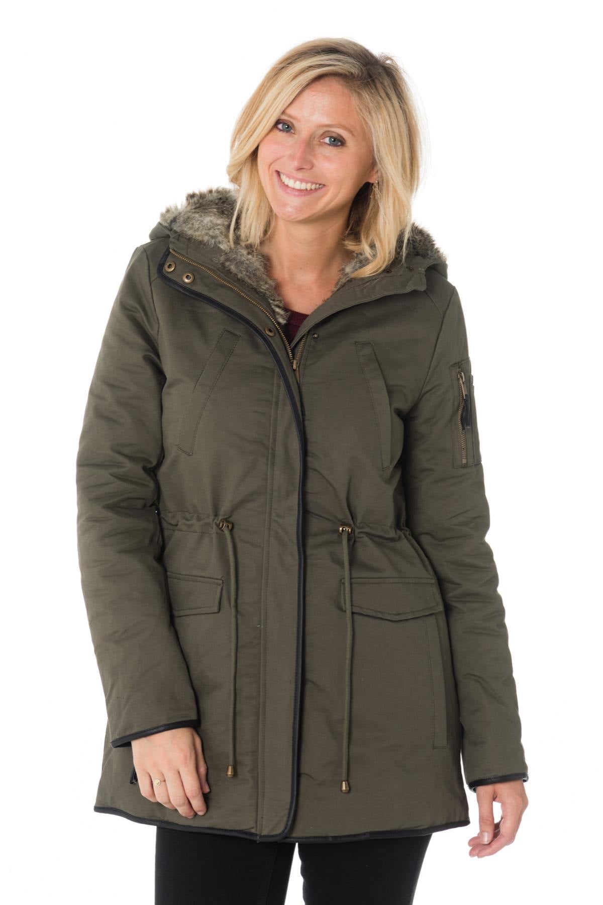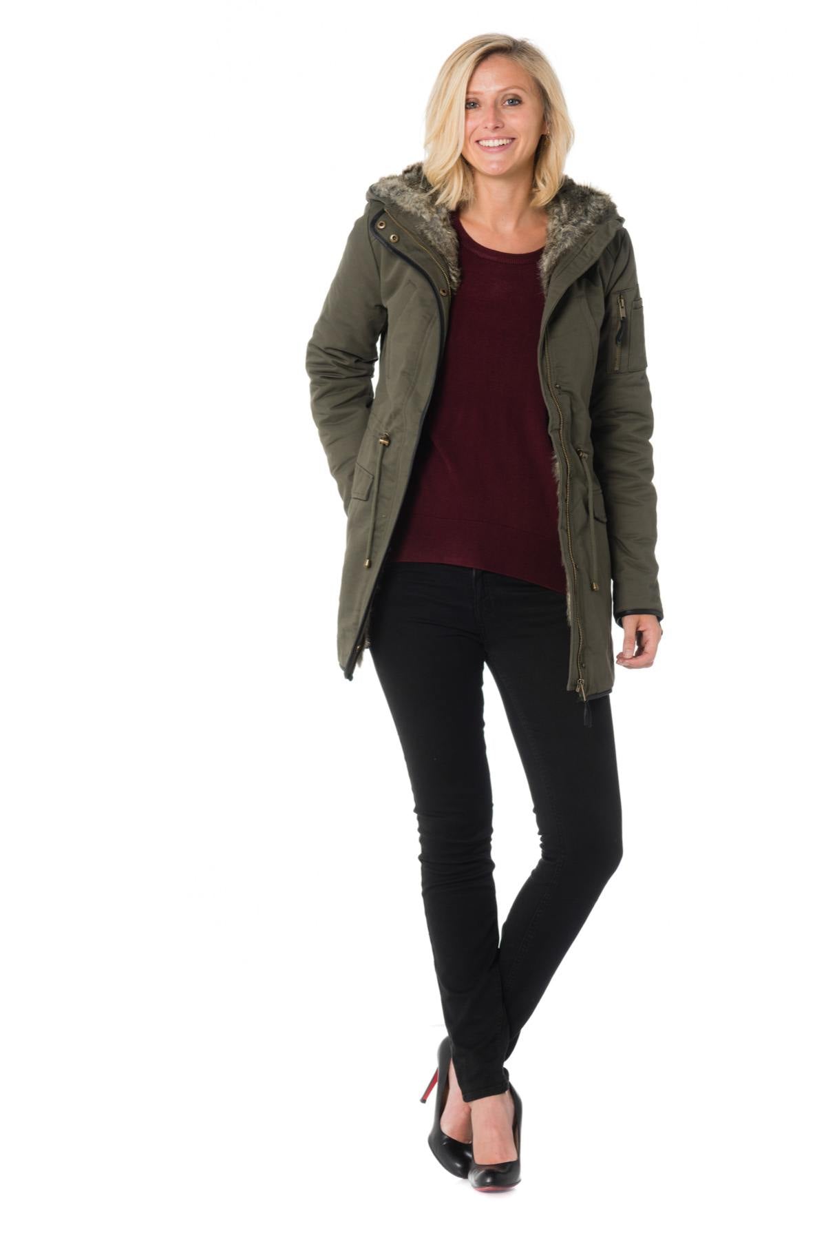 Fixed, fully adjustable hood. fully lined and fixed facing also in synthetic fur.