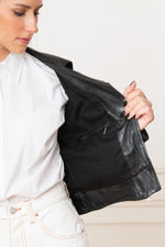 If you like the perfecto, you will be seduced by this one. Its low-cut collar ornate of metal rivets gives rise to an off-center metal zip towards the left. Two zipped pockets are placed on the side. right side of the chest and two others are present above the waist, on each side. Two decorative straps adorn the back of the waist, while the ends of the long sleeves are zipped. The internal lining also has a zipped pocket. Its short waist gives it a pretty feminine touch which will not fail to seduce even the most demanding.