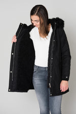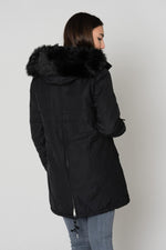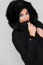 Fixed, fur-lined hood decorated with removable acrylic fur.