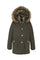 This parka-type jacket has a fixed hood, which covers a detachable faux fur collar. The central part benefits from a central button placket. At the front, two front pockets. Double entry covered with a buttoned flap, are present at the bottom of the jacket. A drawstring is present at the back. the size and ensures the fit. Snaps are also present at the ends of the sleeves and allow adjustment at the cuffs.