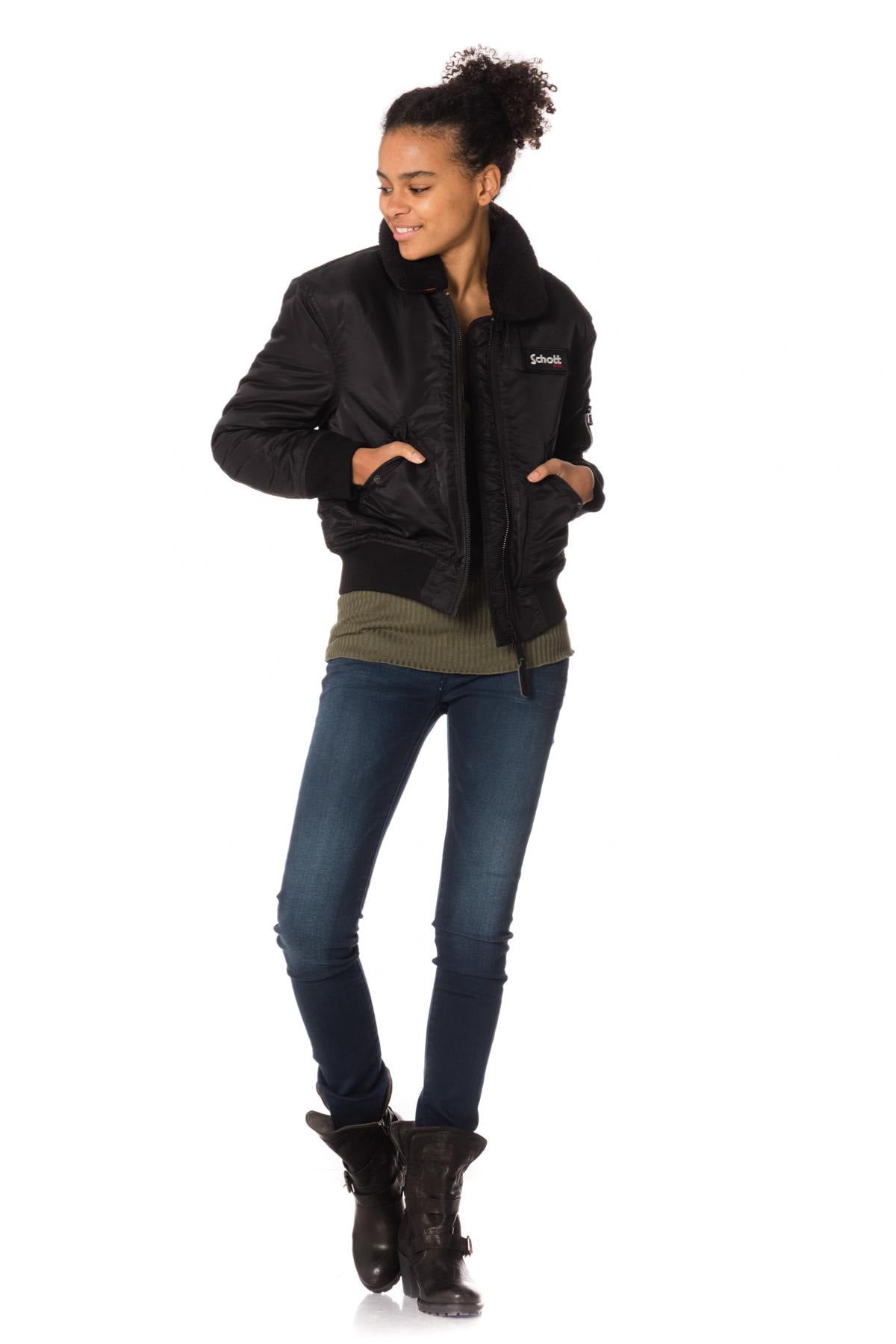 Schott women's black bomber jacket with removable fur collar - Image n°1