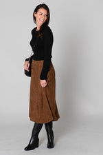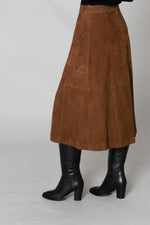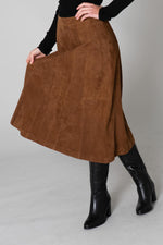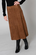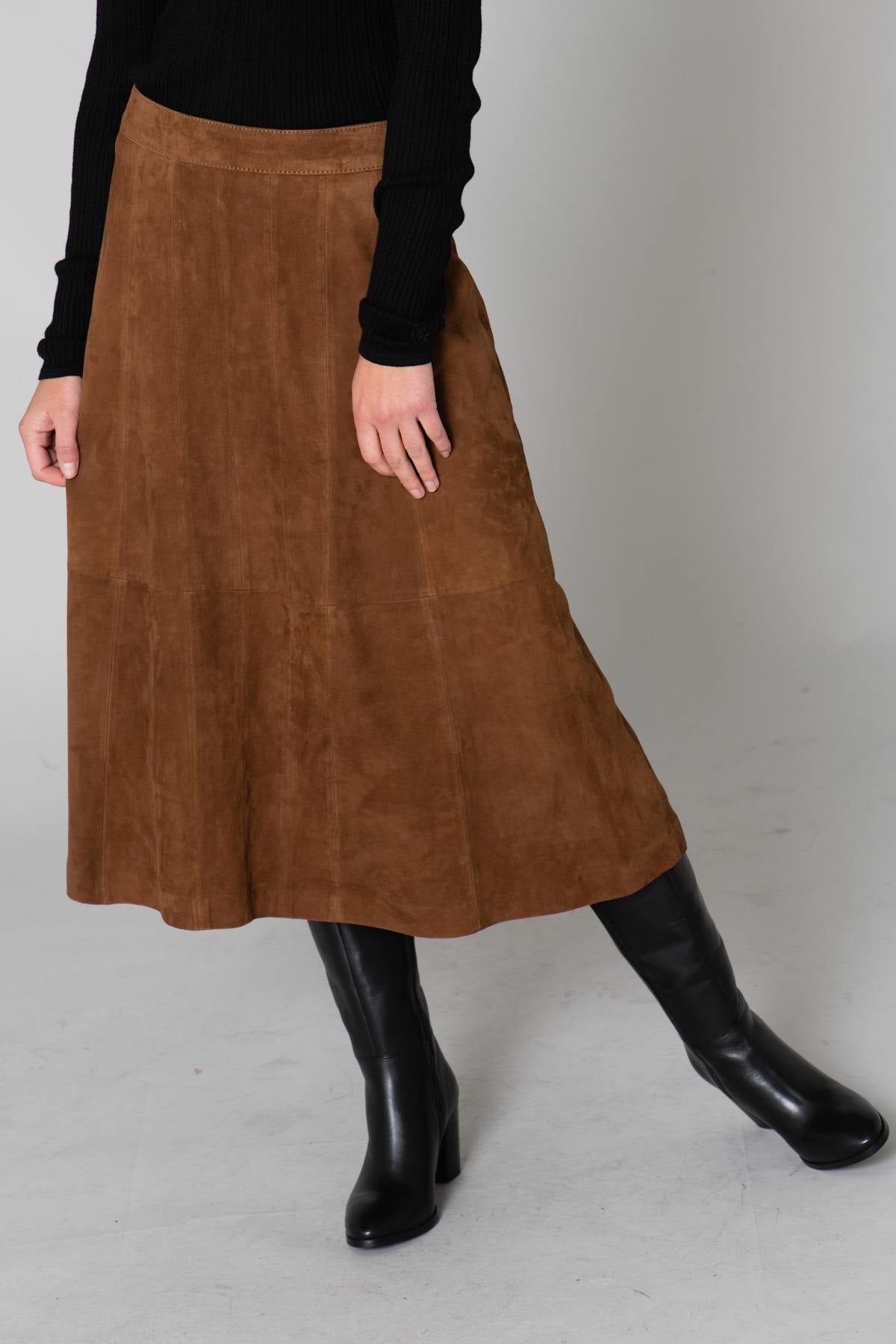 This straight skirt flares out for style and comfort. It closes easily. at the back with a discreet metal zip and a large button. The suede look of this dress matches your outfit. marvelous with the vertical folds arranged symmetrically across its entire surface.