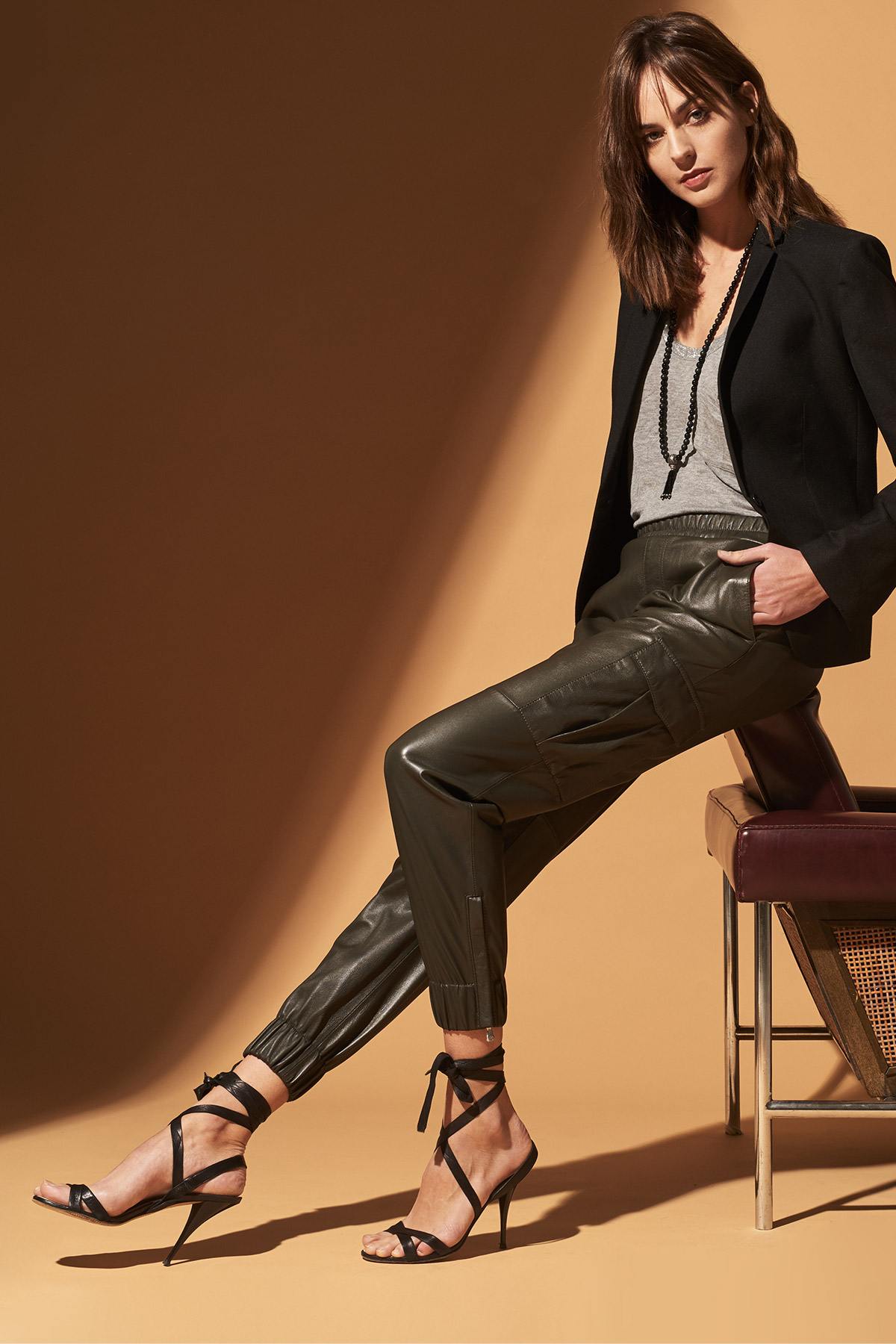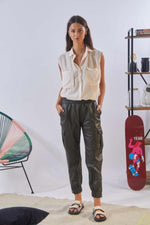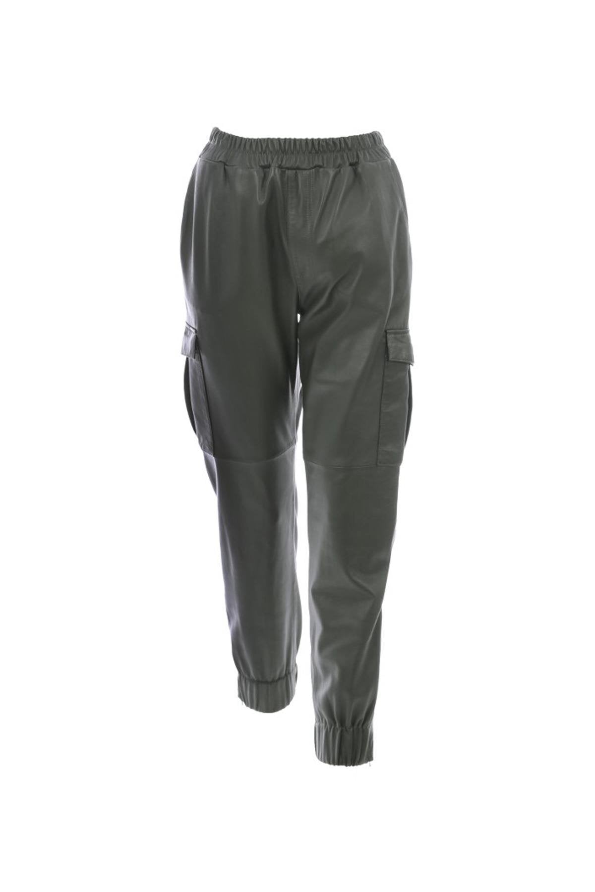 Extremely trendy sheepskin leather pants, the CARGO KAKI 626 model is a hybrid style.