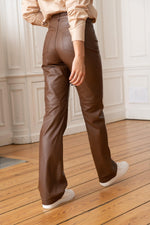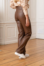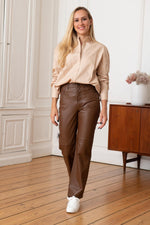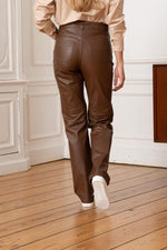 Its brown color allows each detail to stand out wonderfully. through the fine stitching. The waist has a metal button, a zip and loops which ensure the closure system. 5 pockets are present, two of which are on the front. at the back and three others at the back. at the front, obviously including the gusset pocket.