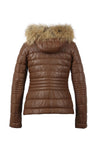 In its down jacket effect, this jacket is perfect for taking care of yourself during this winter period, especially with its large hood with zipper. fur. An original touch that combines protection and class. The sober white lining, contrasts with the wonderful with the tan of the leather. A small pocket is present, while two other zipped pockets are placed on the sides of the external face. A long zipper is sewn on the axis, and the brand badge is flocked to the front. on the basis.
