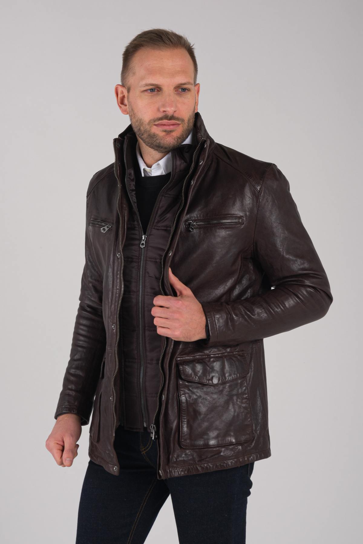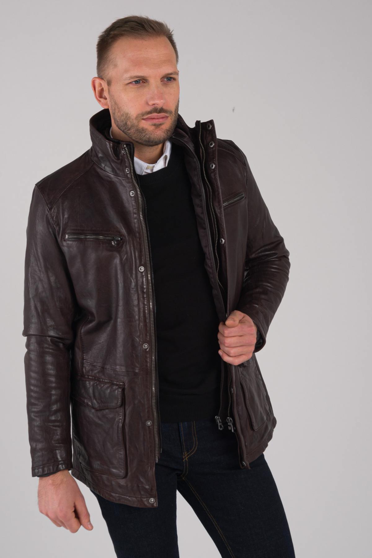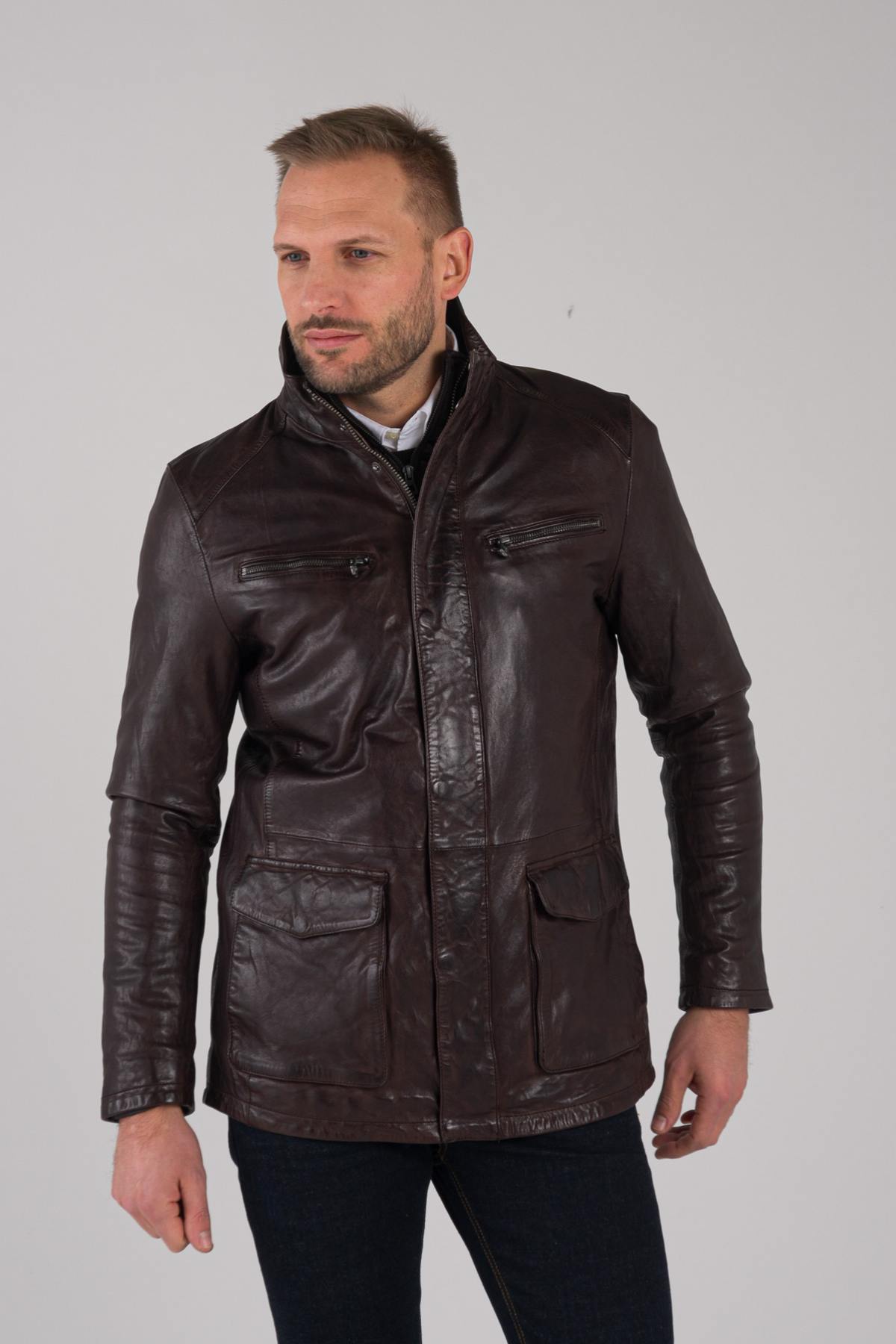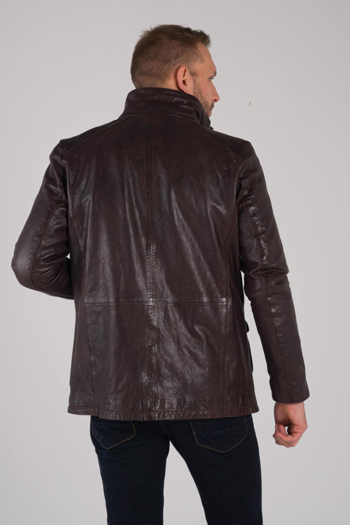 Sheepskin leather jacket Classic and elegant Distressed and marbled appearance Large collar Removable facing and collar 2 front pockets flaps 2 pockets zips Polyester interior lining with storage pockets