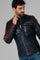 The red bands sewn along the sleeves contrast with the pattern. wonderful with the navy blue of the rest. The typical biker collar collar is equipped with A strap with press studs, while a long metal zip ensures closure along the axis. The two side pockets are zipped as is the one on the side. chest. The brand name is embroidered. in red just above. Another zipped pocket is present on the internal lining.