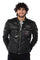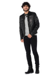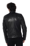 Round collar with 2 snap buttons, this totally black jacket is highlighted by superb aged-look patches, quilting on the shoulders and 2 tone-on-tone bands on each sleeve.