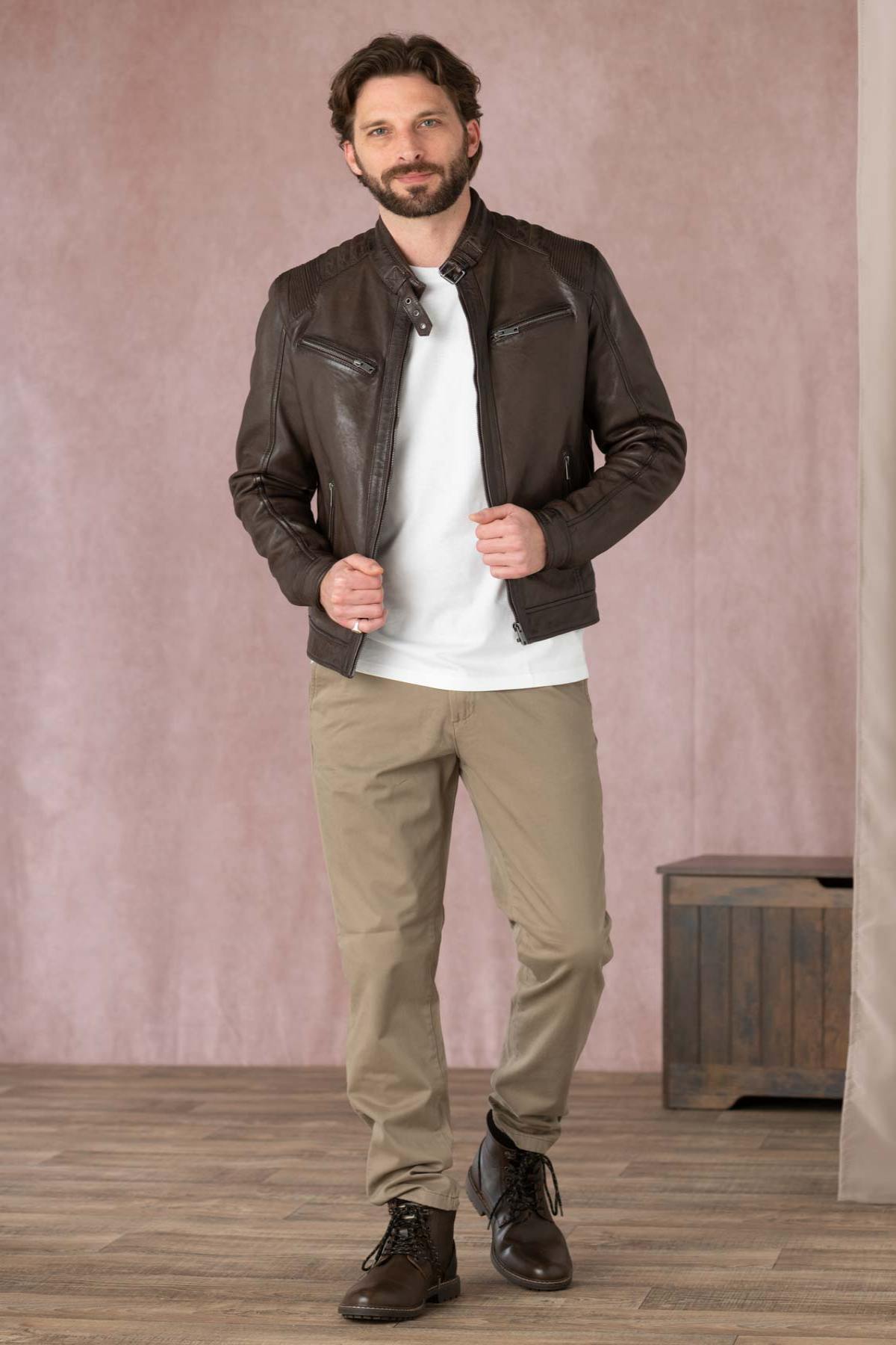Discover the MACIEJ MOCCA jacket by Serge Pariente, a sheepskin leather jacket for men, biker style, with a regular cut and a textured finish. Perfect for a trendy and timeless look.