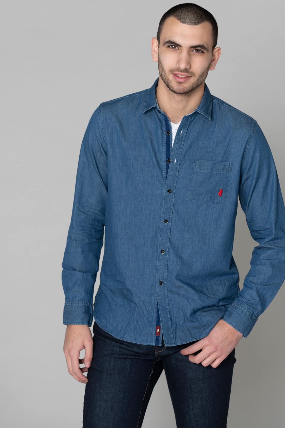 Its blue denim look gives it a casual look. chic and casual. It has a simple collar and a black button closure, as well as long buttoned sleeves. A raglan pocket is placed on the side. left chest. It is embellished with the brand's logo embroidered in red.