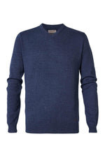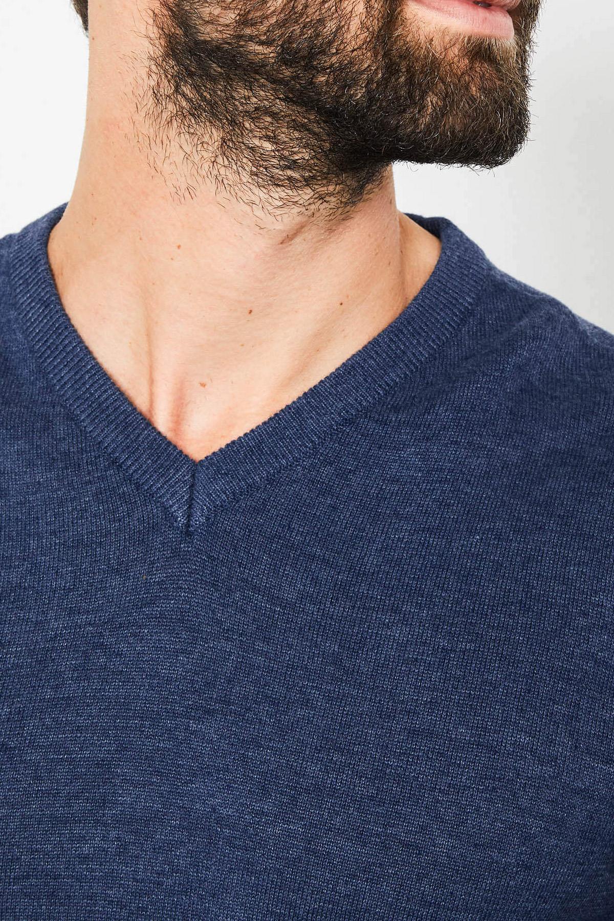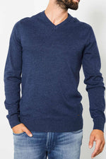 With its mottled surface, this sweater is equipped with a cotton base. with a ribbed V-neck. as are its waist and the ends of its long sleeves. A small brand label is placed above the waist, on the waist side. left.
