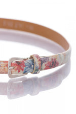 Cowskin leather with floral print. multicolored floral and silver buckle.
