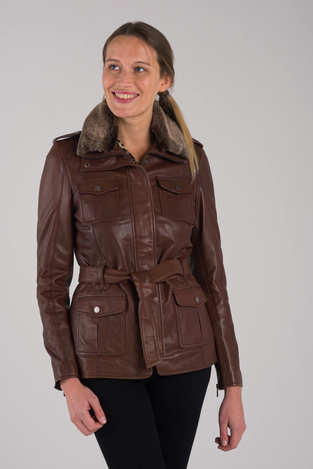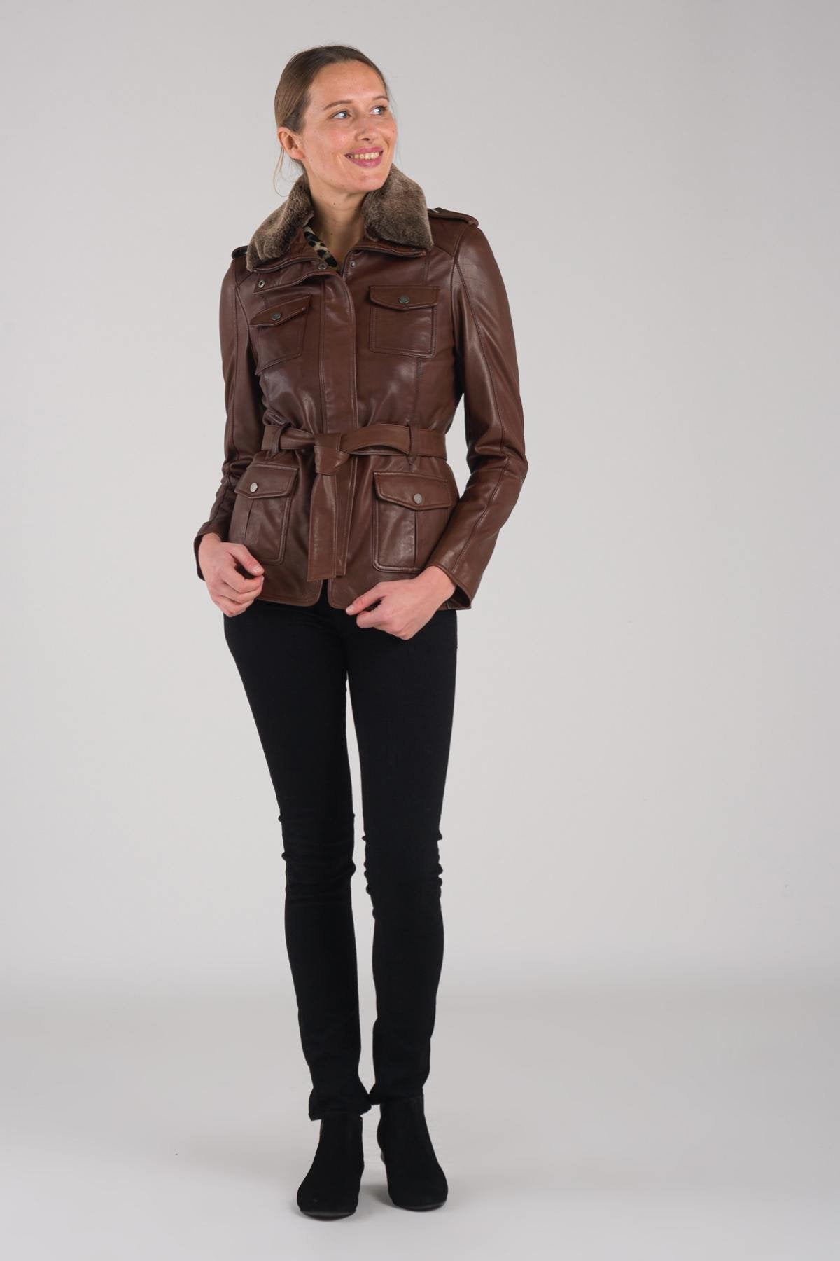 In a know-how combining aviator cut and mid-length coat, this bison-colored jacket has a concealed button placket with a metal zip and snap buttons. Loops through which a belt passes; tie are present on the waist. Which allows you to refine your waist when you wear it closed. Two large zippered pockets Flap are present on each side, as well as two other smaller ones on each side of the flap. of the chest. Two shoulder pads and a metal zip on each sleeve are reminiscent of the marvel the configuration of a perfecto. And to perfect its creation, the brand offers a padded collar. fur for your greatest comfort.