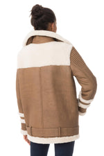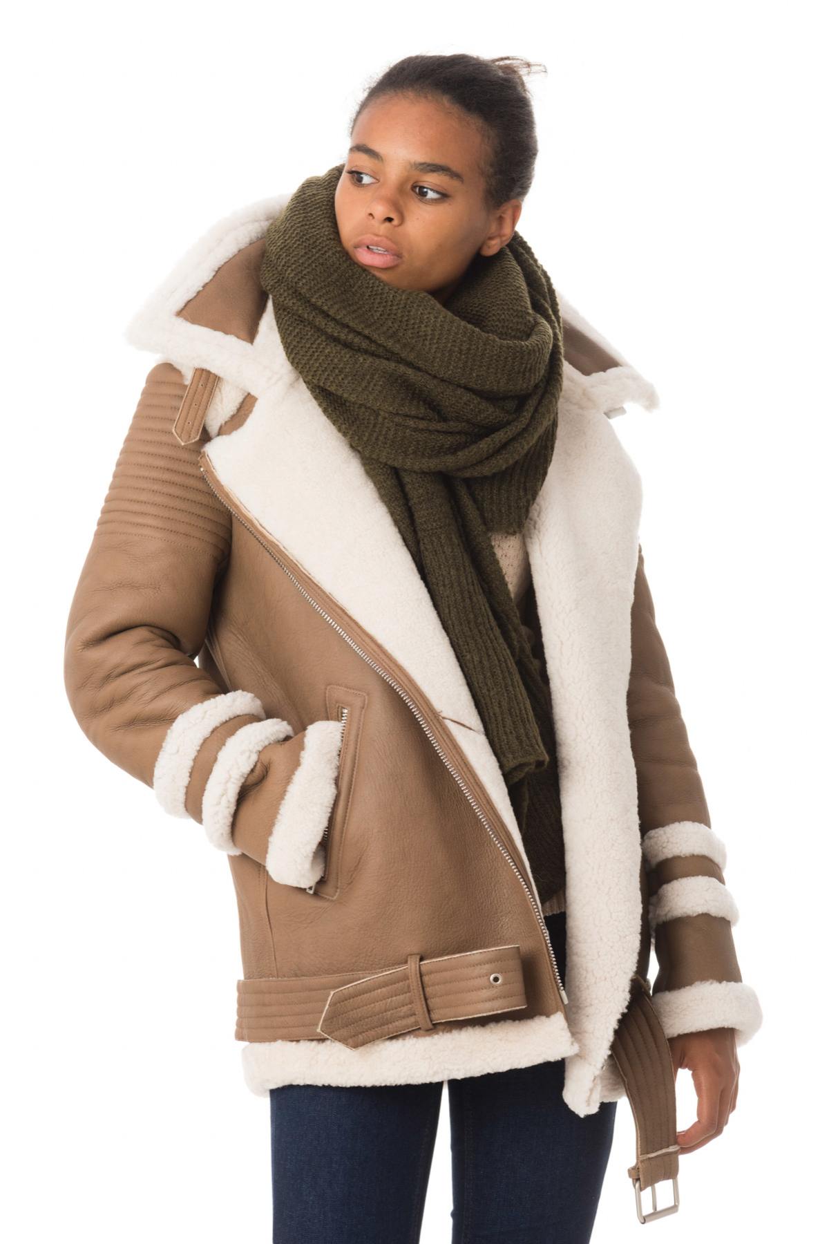 The BOBBY CAMEL is a sublime shearling jacket, combining the perfecto style with its asymmetrical central closure and its high-heeled belt. size and side highly worked bomber with visible sheep fur on the shoulders, collar and sleeves.