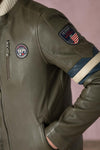 The Gary Sheep Crown Khaki jacket is crafted from smooth khaki-colored sheepskin leather, offering a soft feel and refined look. It is distinguished by its biker collar with snap, its white and blue horizontal bands on the left arm, and its "Steve McQueen" patches which add a touch of authenticity. With its slimfit cut, it is perfectly fitted for a modern and polished look. It has three exterior zipped pockets, including two side and one on the chest, as well as two interior pockets for practical storage. The beige cotton interior lining features a Steve McQueen print, paying homage to the cinema and racing icon.