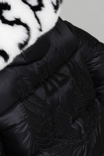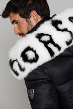 In textile, it has a magnificent raccoon fur, removable by press studs, white with the Horspist inscription on it on the fixed hood with drawstring.