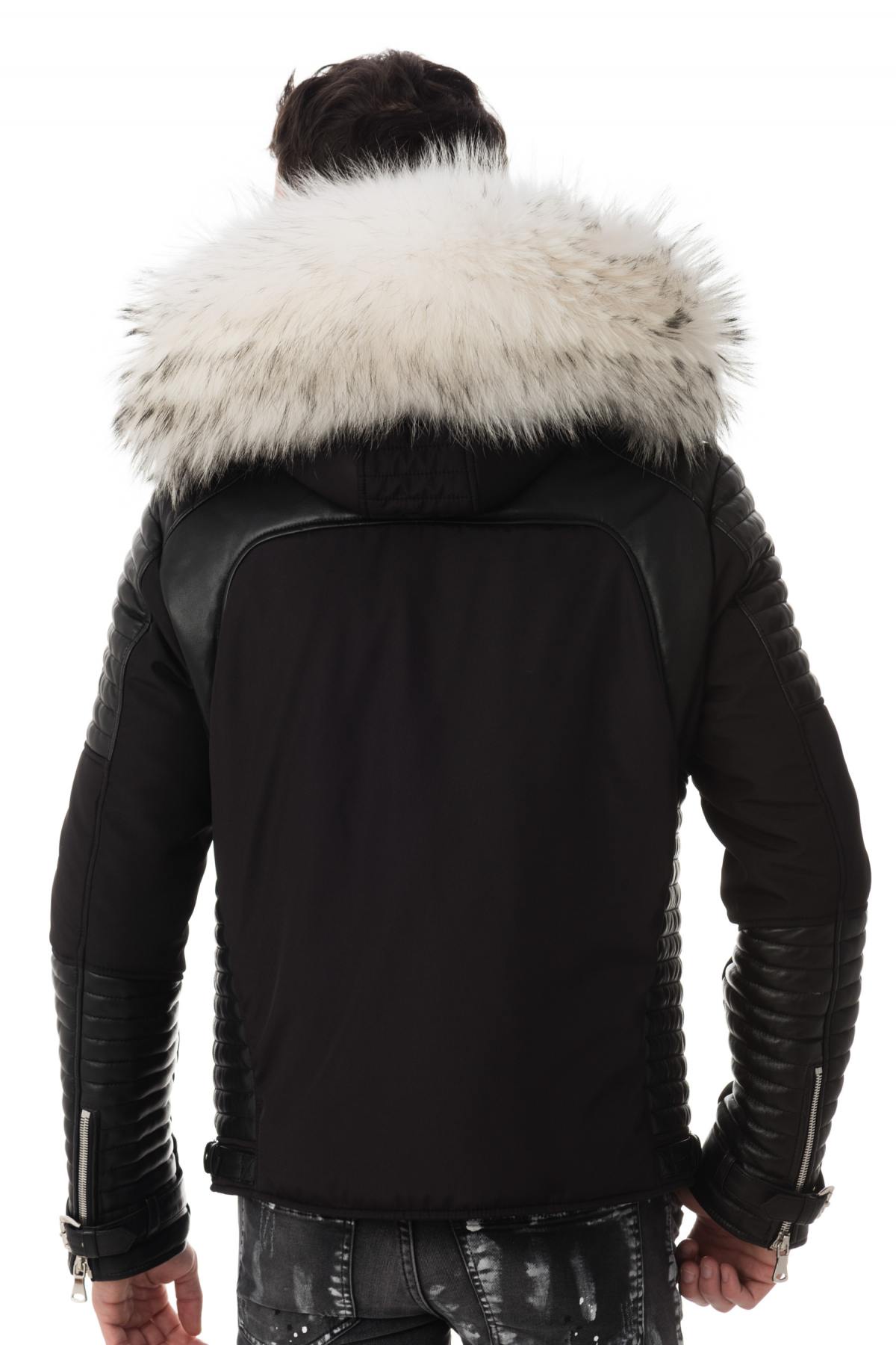 The combination of the total black look enhanced with by a magnificent white raccoon fur brings a magnificent contrast to the surroundings. this jacket.