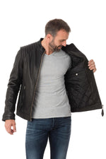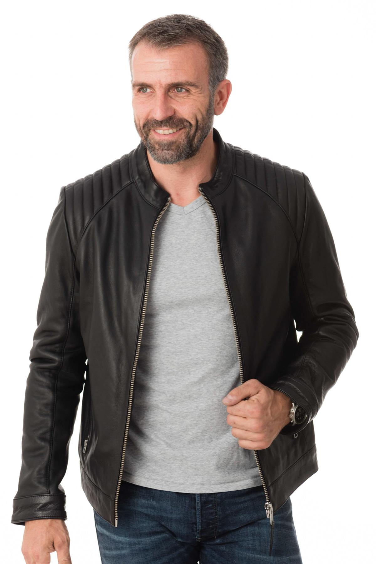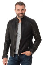 The LCJULES BLACK is a biker style jacket characterized by by its round collar and its quilting at the shoulders.